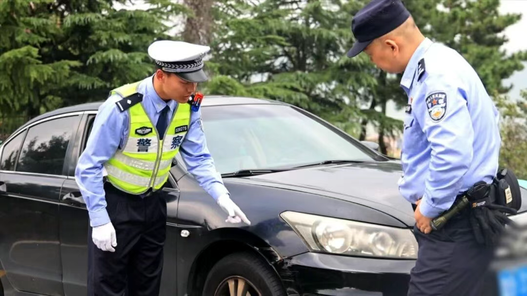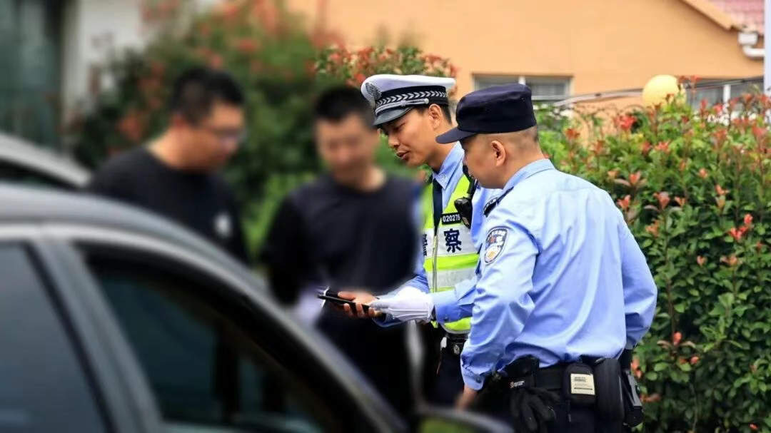 游客王先生笑着说:"一辆警车停下来,同时下来戴蓝帽子的和戴白帽子的。一个管车流,一个劝和解,配合得那叫一个默契!"