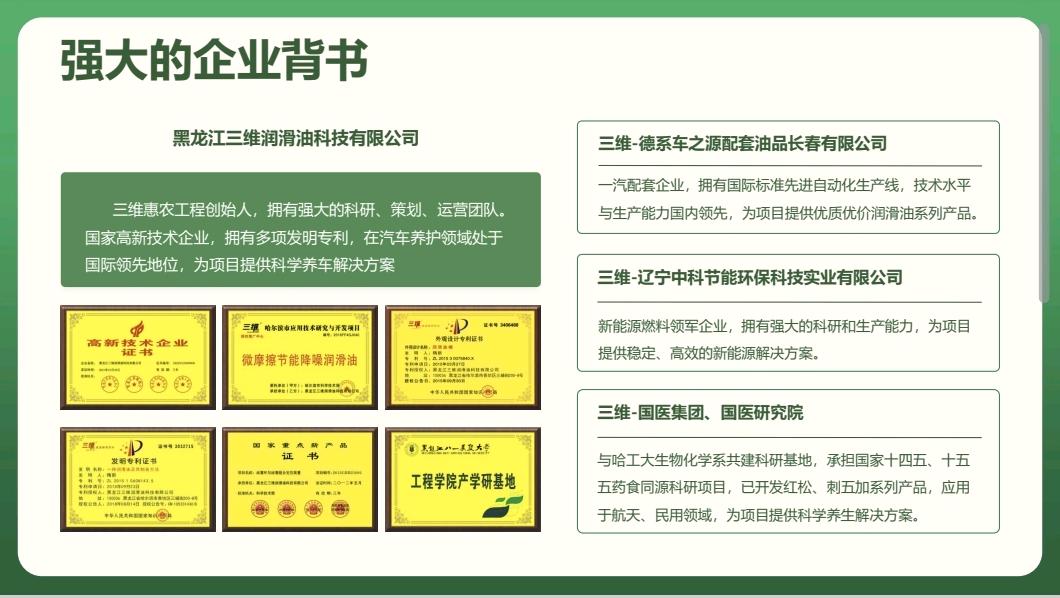三维惠农工程,由资深行业专家牵头创立,拥有一支专业过硬、经验丰富的科研、策划、运营全链条团队,深耕农业机械服务与汽车养护技术领域多年,依托强大的技术底蕴与产业资源,致力于打通农业机械服务最后一公里,切实为农户解决生产经营中的实际痛点。作为国家高新技术企业,项目运营主体拥有多项国家发明专利,在汽车及机械养护领域技术研发实力雄厚,技术水平处于国际领先地位,能够为农机科学养护、高效运维提供全方位、专业化的科学解决方案,为惠农工程落地实施筑牢技术根基。