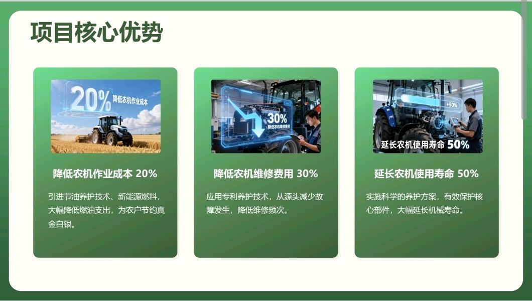 三维惠农工程落地后,将为依兰县农户带来实实在在的收益提升:通过引进专业节油养护技术与新能源燃料,直接降低农机作业成本20%,大幅减少农户燃油支出;应用专利养护技术,强化农机日常养护与核心部件保护,降低农机维修费用30%,减少维修频次与维修开支;通过全周期科学养护方案,精心呵护农机核心部件,有效延缓机械老化,延长农机使用寿命50%,让农机成为农户长期稳定的生产帮手。