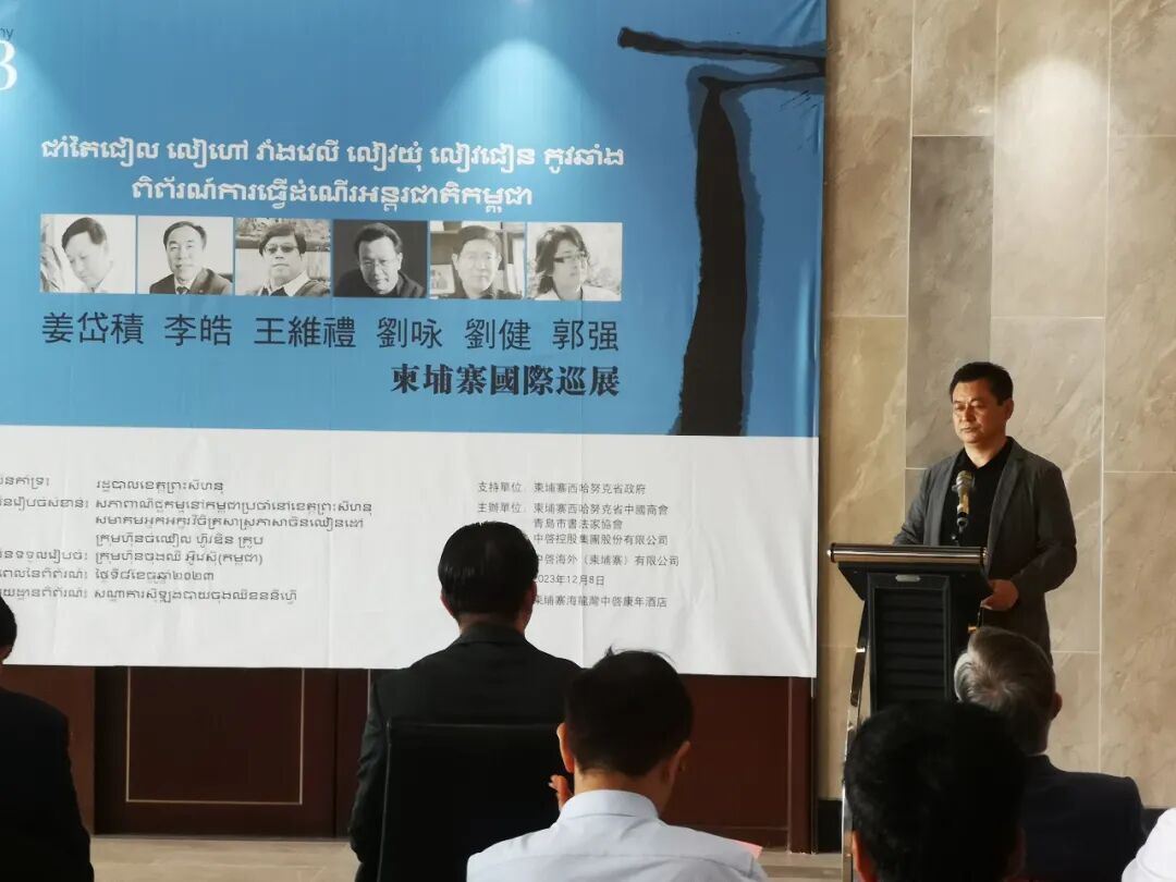 本网青岛讯(记者 于翔 吕勇进)12月8日,由柬埔寨西哈努克省政府支持,柬埔寨西哈努克省中国商会、柬埔寨书法家协会、青岛市书法家协会、中启控股集团有限公司主办、中启海外(柬埔寨)有限公司承办的中国书法“3+3“国际巡展(柬埔寨)站在柬埔寨西哈努克省海龙湾中启康养酒店成功举办。 本次活动,展示了姜岱积、李皓、王维礼、刘咏、刘健、郭强6位来自中国书法家的作品,旨在推广中国传统文化,增进柬埔寨与中国之间的文化交流与合作。出席本次活动的有:柬埔寨西哈努克省副省长蒙西奈先生,办公厅主任胡辉先生,波雷诺县县长伊特林先生,西哈努克省教育、青年、体育局局长吴绍批女士,省文化艺术局局长布博岔先生,公共关系与国际合作处副处长努索派先生,西哈努克省中国商会副秘书长顾夏先生,副会长单位中国免税品集团(柬埔寨)有限公司西港免税店余海先生,柬埔寨书法家协会主席冯利发先生,柬埔寨王国(青岛)商务中心董事总经理,柬埔寨互联网联盟执行主席李锡新先生。中启控股集团股份有限公司董事、副总裁姜焕胜先生,中启控股集团有限公司董事、副总裁、中启海外(柬埔寨)有限公司总经理张禄泽先生。 柬埔寨西哈努克省副省长蒙西奈致辞 柬埔寨西哈努克省副省长蒙西奈在开幕致辞中表示:柬埔寨西哈努克市与青岛市是友好城市,都是滨海城市。西哈努克省大力支持此类文化交流活动,增进两国人民之间的友谊。 山东省教育书法家协会副主席,青岛市书法家协会顾问 山东省教育书法家协会副主席,青岛市书法家协会顾问刘健在致辞中表示:中国书法历史源远流长,在世界上作为文字的艺术是独一无二的,书法即是中国的,也是世界的。 中启控股集团股份有限公司董事、副总裁 姜焕胜先生致辞 巡回展开幕后,柬埔寨西哈努克省副省长蒙西奈率领相关官员与各位书法就作品进行了详细的交流,各位书法家分别介绍了各自作品的特点,独特的含义。柬埔寨政府官员以及文化人士对中国书法艺术产生了浓厚的兴趣。 山东省教育书法家协会副主席,青岛市书法家协会顾问 青岛市文联副主席、青岛市书法家协会名誉主席 青岛市政协原副秘书长、青岛市政协书法院执行院长 山东省书法家协会副主席,青岛市书法家协会主席 此次活动中,柬埔寨书法家协会主席冯利发对参与巡回展的作品给予了高度评价,各有特色,而且书法功力深厚,并向参加活动的柬埔寨政府官员以及文化人士深入浅出的讲解了作品的特色。 柬埔寨书法家协会主席冯利发先生向西哈努克省副省长 青岛书法家协会与柬埔寨书法家协会未来也将增加更多的交流,举办更多具有影响力和艺术价值的书法活动,带来更多精彩的艺术盛宴,共同推动中柬两国在文化领域的交流与合作,为两国人民之间的友谊添砖加瓦。 西哈努克省副省长蒙西奈与中柬书法家合影留念