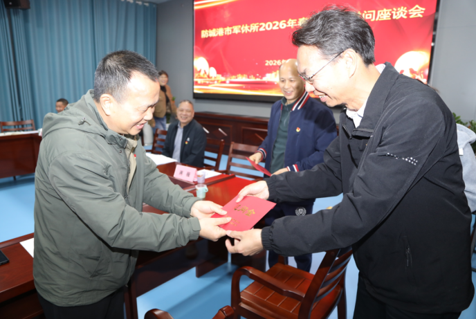 座谈会上,市退役军人事务局领导首先致辞,全面回顾了2025年防城港市双拥共建成果,特别提到驻军部队、退役军人群体在抗洪抢险、乡村振兴中的突出贡献,向军休人员致以诚挚感谢和新春祝福,并代表市委、市政府为全体军休干部发放春节慰问金,传递党和政府的关怀。随后,全体人员观看了全国“最美拥军人物”刘华强先进事迹视频,感受军人的忠诚与担当。座谈中,军休人员积极建言献策,就医疗保障、活动阵地建设等提出建议,现场气氛热烈。