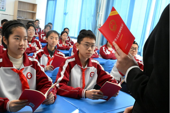 12月4日上午,山东省青岛市即墨区人民法院法官法官韩爽、王洁走进即墨区新兴中学,在课堂上以几个与宪法相关的问题切入,通过互动提问,开始了宪法课堂进校园的“宪法课”。
