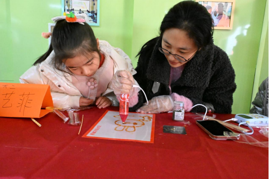 在山东省青岛市即墨区皋虞路幼儿园开展的“赶年集 迎新春”活动中,家长和小朋友一起制作糖稀画