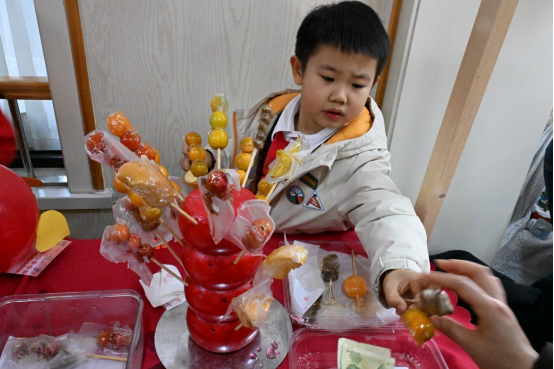 现场热闹非凡,不仅有喜庆的对联、诱人的糖葫芦、软糯的棉花糖、香甜的爆米花等年味十足的摊位,还有小朋友和家长带来的“年货”。 “卖年货喽,走过路过不要错过哦!”“甜甜的、酸酸的糖葫芦,2元1个!”小卖家们使出浑身解数,像模像样地吆喝着。