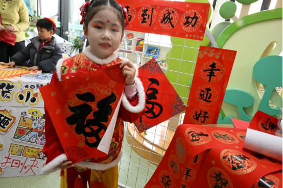 在山东省青岛市即墨区皋虞路幼儿园“年货大街”上,一名小朋友手拿书写的“福”字,送新春祝福