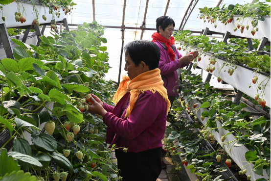 山东省青岛市即墨区段泊岚镇东尖庄村农民在采摘草莓
