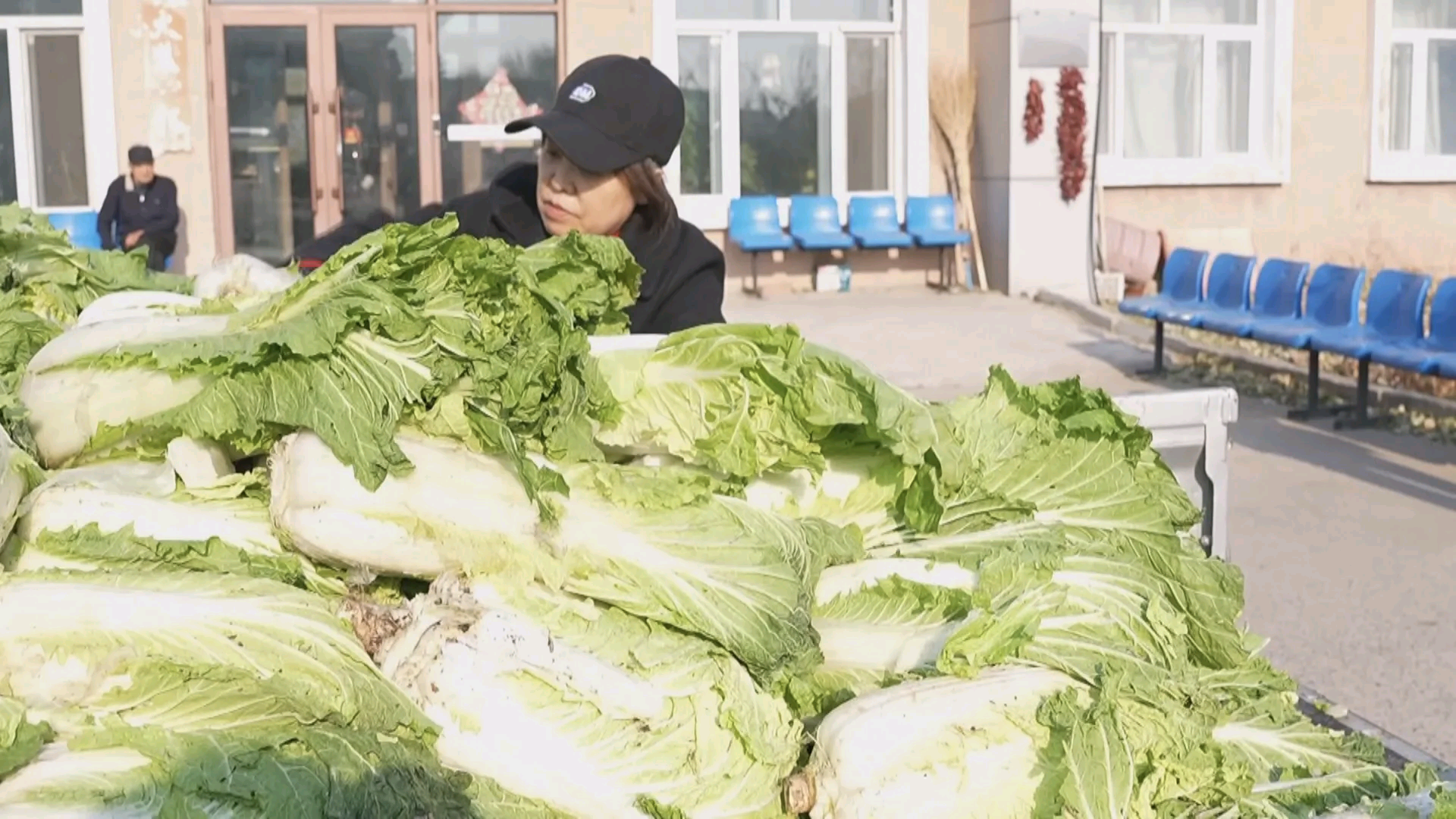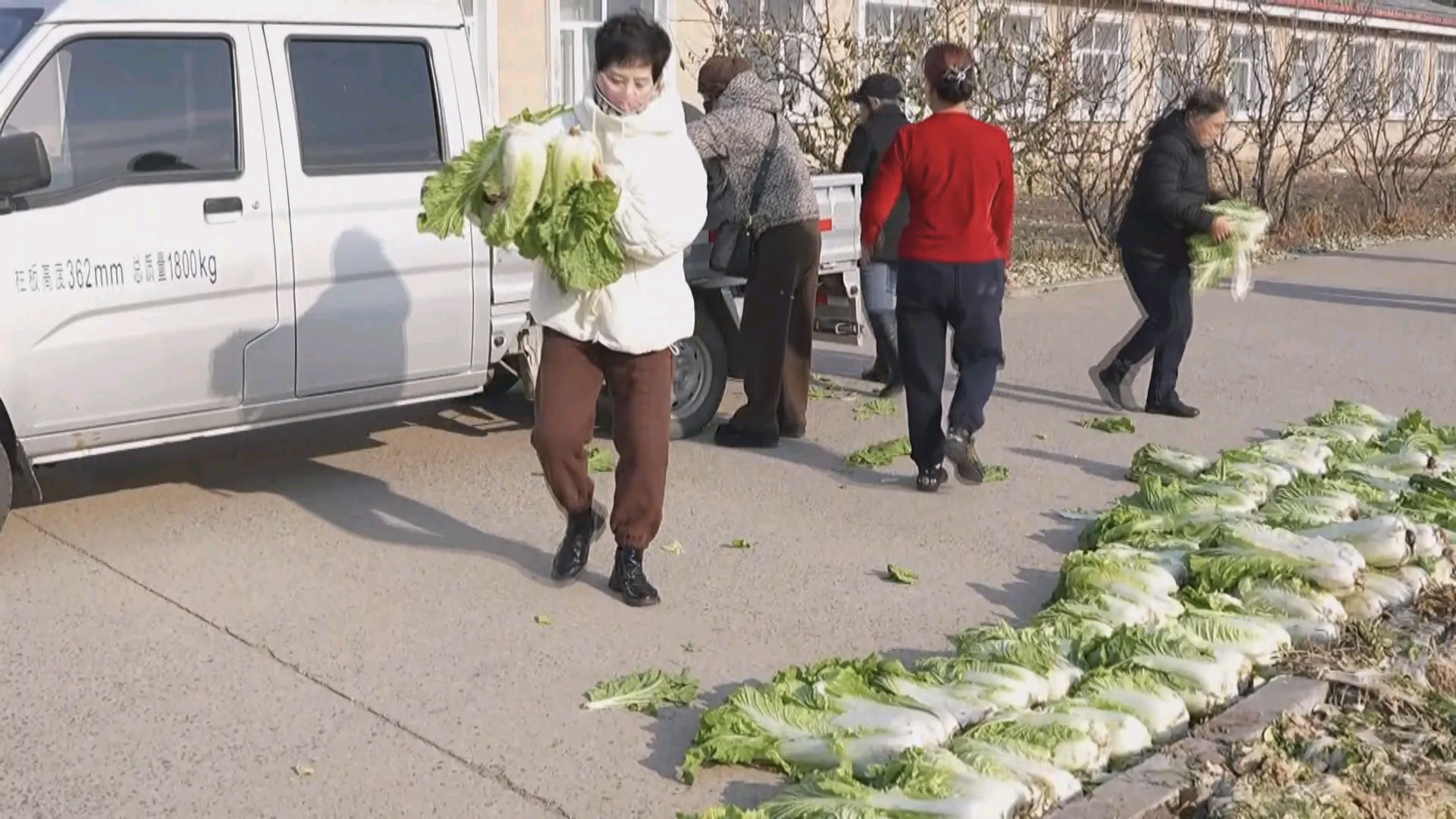 在养老院门前,大家齐心协力将颗大饱满的新鲜大白菜搬运至晾晒区,并与老人亲切交谈,询问起居情况,现场一片温馨的氛围。