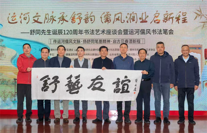 本网青岛讯(记者 吕勇进 崔启昌 通讯员 刘宗伟)11月22日, 舒同诞辰 120 周年书法艺术座谈会暨舒同题签精品展在山东省德州市柳湖书院举行,来自德州、青岛、烟台、淄博等地书法名家、文化学者、企业家及媒体代表齐聚一堂,通过座谈交流、参观展览、现场笔会等形式,缅怀书法巨匠,传承红色文化,探讨文化与品牌融合新路径。