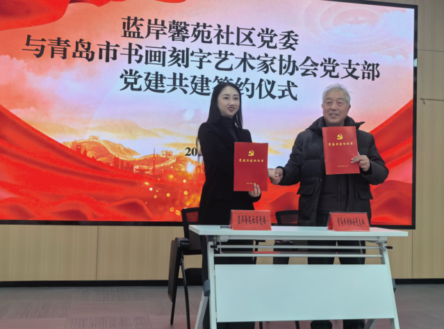 党建共建搭桥梁,资源共享促发展。活动现场,蓝岸馨苑社区党委与青岛市书画刻字艺术家协会党支部正式签署党建共建协议,标志着双方在文化共建、资源共享、服务共推等领域开启深度合作新篇章。未来,双方将依托各自优势,把书法、绘画等艺术融入社区党建与文化建设,让传统艺术在基层落地生根,为居民带来更丰富的文化体验。