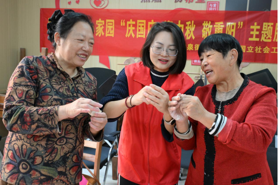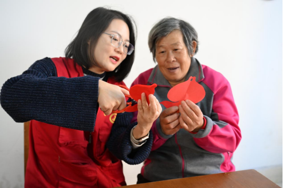 山东省青岛市即墨区国立巾帼志愿者走进即墨区龙泉街道天一仁和郡社区开展献爱心迎重阳家政服务活动,志愿者与老人在剪纸