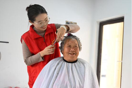 山东省青岛市即墨区国立巾帼志愿者走进即墨区龙泉街道天一仁和郡社区开展的献爱心迎重阳家政服务活动,志愿者为老人免费理发
