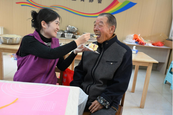 山东省青岛市即墨区国立巾帼志愿者走进即墨区龙泉街道天一仁和郡社区,开展献爱心迎重阳家政服务活动,青年志愿者同老人分享蛋糕
