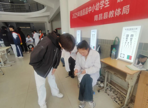 在教学楼一楼大厅,在班主任老师带领和志愿者引导下,同学们分班级有序进入筛查现场。南昌爱尔眼科的医护人员携带专业检测设备,为同学们依次开展视力检测、电脑验光、色盲色弱筛查三大项目。筛查过程中,医护人员耐心引导学生配合检查,细致记录每一项数据,同时针对部分视力异常的学生,现场讲解科学用眼常识,提醒其及时就医复查。此外,医护团队还贴心为教师提供视力筛查服务,关注教职工用眼健康,传递科学护眼理念。
