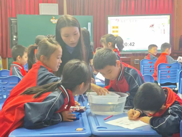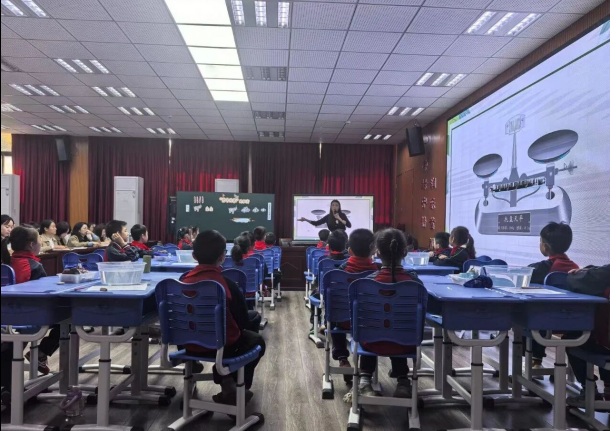 南昌县斗柏路小学教师金辰悦执教《曹冲称象的秘密》。金老师从AI数字人入手,重现曹冲称象故事,唤醒学生已有认知,引发数学思考。通过实验视频演示,引导学生聚焦“水位线”这一关键,初步感知“等量的等量相等”原理;以“模拟称象”小组实验为核心,学生利用水盆、仿真大象模型等工具合作操作,在实践中理解“化整为零”策略和“总量等于分量之和”的数学事实。通过推理验证等量关系,用符号抽象出数学模型,结合生活实例拓展延伸,链接古今称重技术,渗透家国情怀。