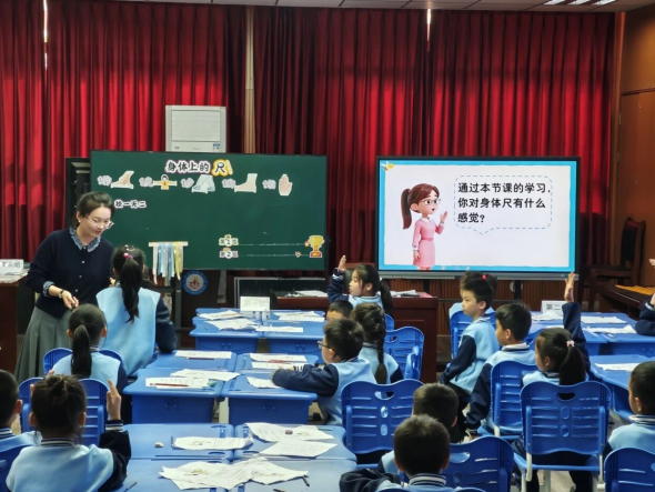 莲塘一小教师梅婕执教《身体上的尺》。梅老师安排了丰富的实践操作活动,让学生自由选择身边熟悉的、喜欢的物体用“身体尺”进行估测和测量,在实际操作中互相启发、互相补充,感受用“身体尺”测量的方法,不断积累度量经验。学生在这个过程中通过估测,对度量单位的大小形成鲜明的表象,不断感受度量单位的实际意义,将思维聚焦到度量的本质,使得生活空间转化为度量空间。