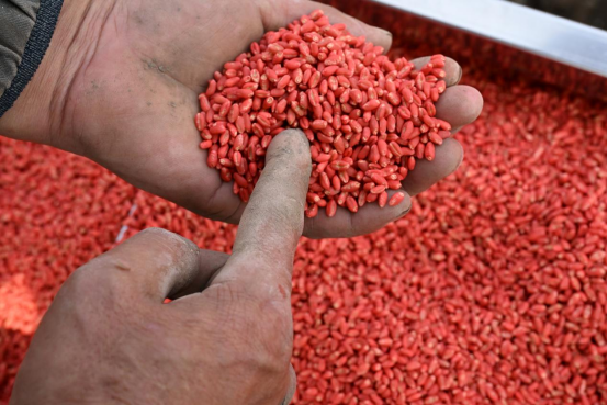 山东省青岛市即墨区段泊岚镇西瓦戈庄村农民在查看冬小麦种子