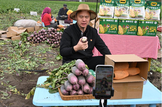 山东省青岛市即墨区段泊岚镇栗林村党支部书记在萝卜收获地头开设抖音直播,帮助农民销售萝卜