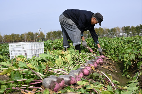 栗林村党支部书记宋吉阳一边在地里忙碌,一边通过电话联系外地客商。这位年轻的村支书还把抖音直播室开设在萝卜收获的田间地头,现场直播带货,帮助农民销售萝卜。“我们今年试种了70亩的‘冰激凌’水果萝卜已成熟,长势良好,每亩产量在5000----6000斤左右。销路很好。”
