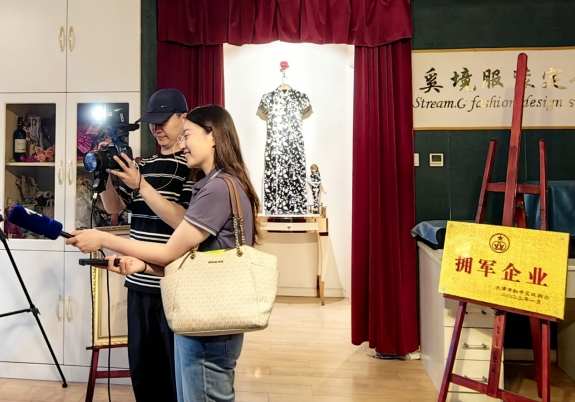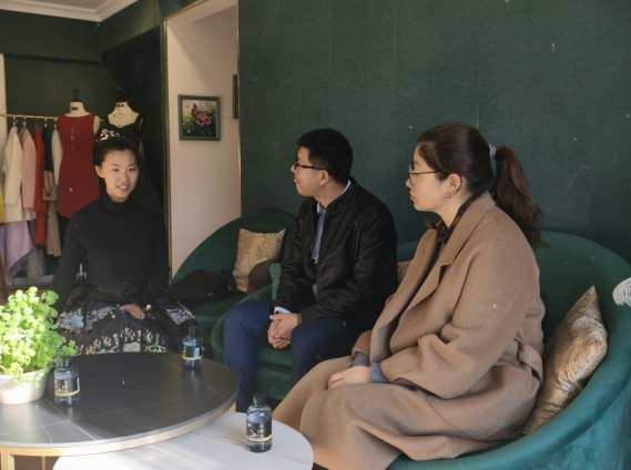 当日上午九时许,高磊理事一行抵达门店,在姜小溪的陪同下,先后参观了店内生产设计设备与各类服饰展品,姜小奚同步简要介绍了个人经历及奚境服装定制店的发展概况。