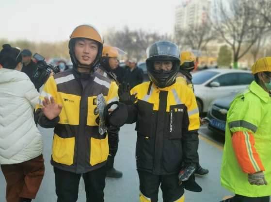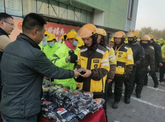 领到保暖物品的外卖小哥露出了温馨的笑容