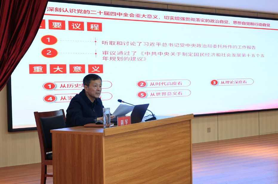 为深入学习领会党的二十届四中全会精神,准确把握全会关于“十五五”时期发展的重大部署,12月4日,河北省地质矿产勘查开发局第四水文工程地质大队(简称水文四队)召开学习贯彻党的二十届四中全会精神宣讲会,党委书记简军作宣讲报告,班子成员、中层干部、各党支部书记共计60余人参会。