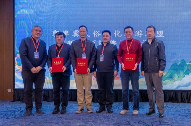 京津冀民俗文化旅游联盟增聘张旗院长、唐志强研究员及民俗艺术家高福厚为联盟高级顾问,北京民俗旅游协会会长魏广川、河北省邯郸市旅游协会会长董春立、北京通州文化旅游协会秘书长杜山川代表联盟向三位高级顾问颁发荣誉证书。
