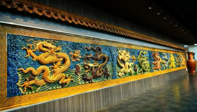 博物馆内的九龙璧琉璃造型独特,气势恢宏。九龙璧上的龙纹雕刻细腻,龙身蜿蜒盘旋,栩栩如生,仿佛随时都会腾空而起。琉璃的色彩运用更是精妙绝伦,以红、黄、绿和孔雀蓝等色彩为主色调,相互映衬,使得整个作品光彩夺目,极具视觉冲击力。