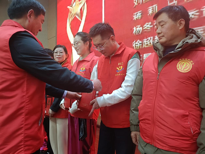 首先播放了世纪爱心服务队十周年成长纪录片,一张张珍贵的照片、一段段感人的视频,生动再现了服务队从创立之初的寥寥数人,发展到如今拥有555百名骨干队员、惠及万千群众的爱心团队的非凡历程。十年来,服务队始终秉持“奉献、友爱、互助、进步”的志愿精神,在扶贫济困、助老扶幼、社区服务、文明创建等多个领域开展了形式多样、富有成效的志愿服务活动,赢得了社会各界的广泛赞誉。会上,淮安世纪爱心服务队队长张勇作了题为《十年爱心路,再谱新篇章》的工作报告。报告全面总结了服务队2025年的工作成果:关爱自闭症儿童、智障儿童、聋哑儿童、福利院儿童、留守儿童、服刑人员子女7000多人次,走访留守儿童11000人次,。关心照顾麻风病康复中心老人,残疾老人,敬老院老人5200多人次,为困境儿童和他们的家庭提供助学金和帮扶款120余万元,生活用品和学习用品110余万元。长期结对帮扶102个家庭的132个学生,为79个完成学业,29人圆了大学梦。开展各种公益活动1000多场次。区以上表彰22次,省级表彰4次,18位队友获得区级以上表彰,其中二人获得国家级表彰,12人获得省市级表彰。以实际行动书写新时代奉献、友爱、互助、进步的志愿精神。2018年2024年连续被淮安市民政局授予4A 信用等级企业,2019年被淮安市委年授予我们团队:“践行周恩来精神模范团队”。