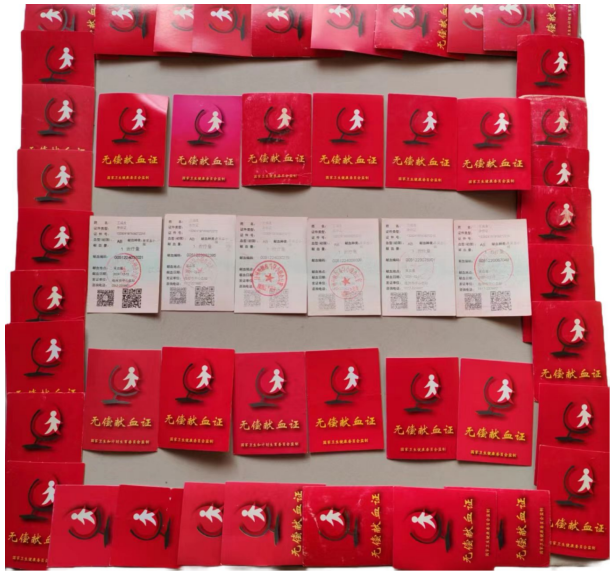 献县红十字无偿献血协会会长王成良的60多本献血证