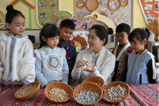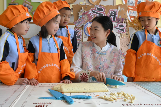 山东省青岛市即墨区皋虞路幼儿园的老师利用“面棋子”在给小朋友们讲述“二月二,龙抬头,吃面棋”的来历和习俗