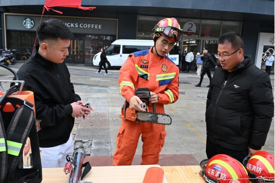 山东省青岛市即墨区消防救援大队队员在即墨区宝龙广场向市民讲解消防救援器材使用方法