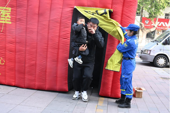 山东省青岛市即墨区市民从当日消防演练现场火场逃生体验屋内走出来