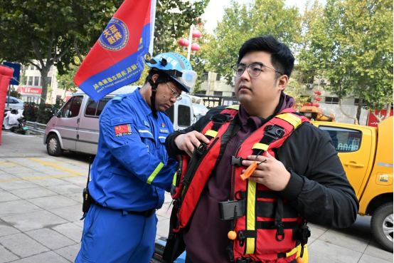 山东省青岛市即墨区蓝天救援队队员教授市民正确穿戴救生衣