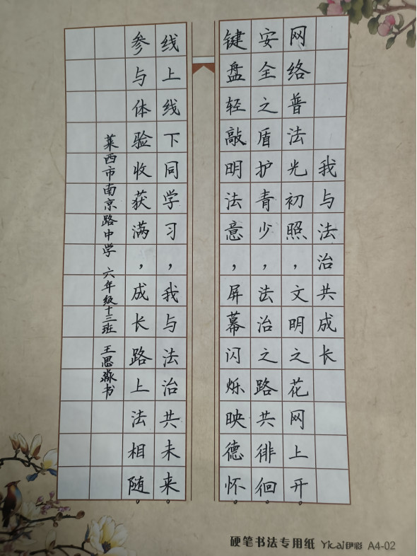 本网青岛讯 (通讯员 宋学友 赵青)为进一步增强学生群体的反诈防骗意识,提高应对新型电信网络诈骗的自我保护能力,近日,一场集教育性、艺术性、娱乐性于一体的沉浸式体验打卡反诈活动在青岛莱西市南京路中学拉开帷幕。莱西公安反诈民警打破传统反诈宣传的固有模式,巧妙地将反诈宣传融入书法艺术和绘画艺术中,为同学们带来一场别开生面、趣味十足的反诈宣传活动。
