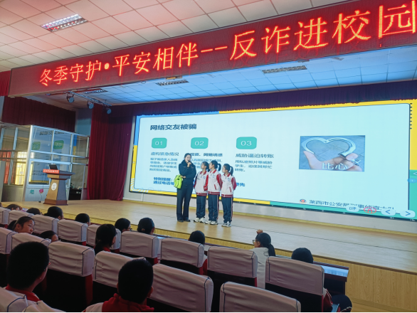 “如果有人告诉你可以低价充值游戏货币、免费领取游戏皮肤,如果有人让你的爷爷奶奶参与社会养生免费讲座和购买各种保健品,不要轻易相信他们,因为他们极有可能就是骗子……”民警李沅姝摒弃枯燥说教,紧扣学生关注的游戏账号交易、追星打榜、网络兼职等话题,结合真实案例,用诙谐幽默的语言向同学们讲述诈骗分子如何实施诈骗行为及电信诈骗的危害,深入浅出地为同学们剖析了各类电信网络诈骗的手段特点,并声情并茂的教授同学们应对防范诈骗的方式方法,同时提醒同学们在日常生活中要提高警惕,如遇可疑情况,要多和家人、老师沟通商议或及时报警,做到“不点击未知链接、不轻信陌生来电、不透露个人信息。