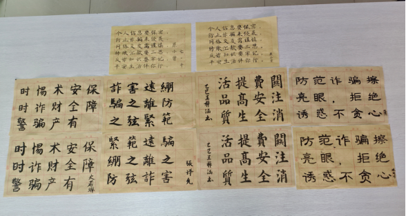 “防范诈骗擦亮眼,拒绝诱惑不贪心”“紧绷防骗之弦,远离诈骗之害”“不点击陌生网站,不透露个人信息”……活动期间,民警号召爱好书法、绘画的同学用纸笔创作反诈书画作品,鼓励同学们在学习和生活中努力做一名反诈宣传小使者,得到了同学们的积极响应。书法爱好同学们热情高涨,挥毫泼墨,创作出一幅幅寓意深刻的反诈书法、绘画作品,将平常入脑、入心、入行的反诈知识写出来、画出来。此次活动以艺术为载体,将反诈知识与书画创作相结合,吸引了学生的广泛参与,让更多学生在欣赏书画之美的同时,牢记反诈知识,绷紧防范之弦,共同守护校园安全。