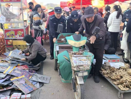 每逢大集,鲍锋的肩上又多了一份责任,“女士,拉紧孩子”“师傅,车往这边靠,别堵着通道!”“大娘,买完菜抓紧走,人多看好随身物品!”沙哑的嗓音在喧闹的集市里回荡,他的身影穿梭在熙熙攘攘的人群中,一刻也不停歇。