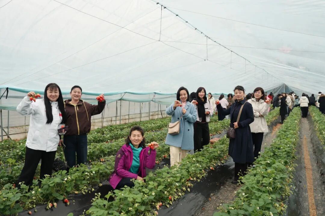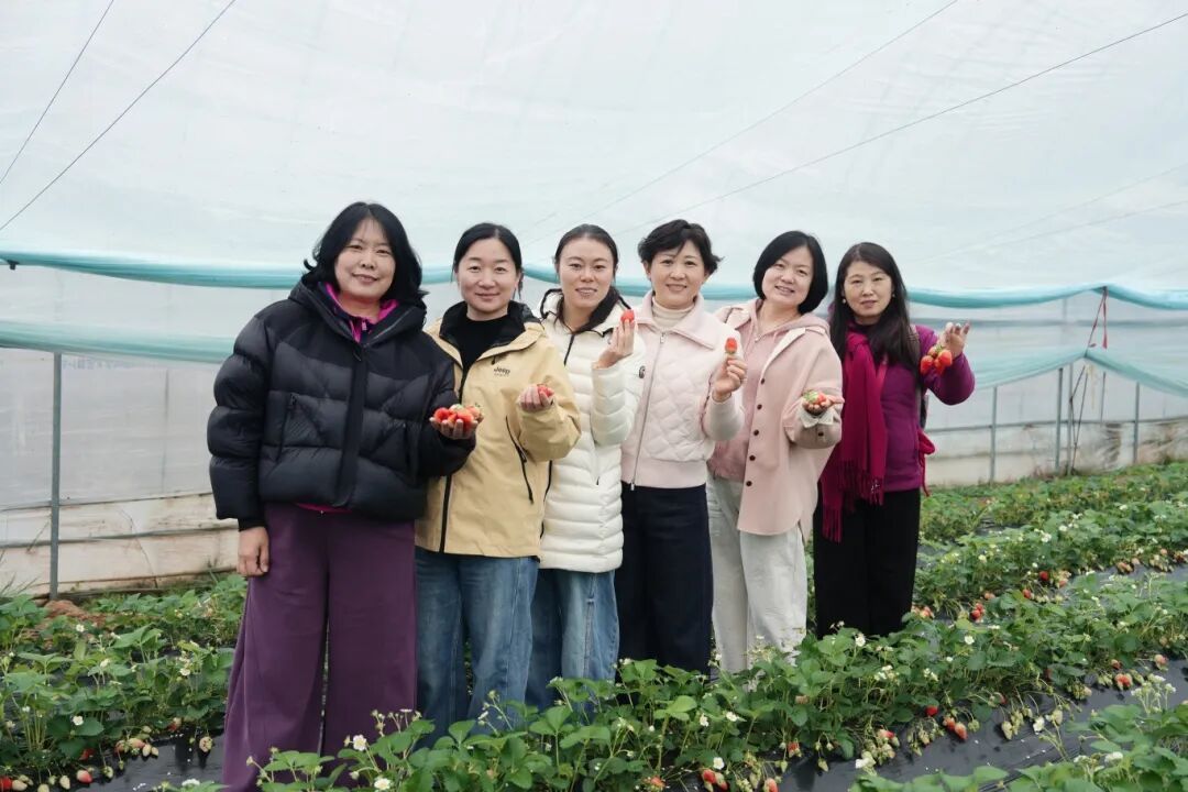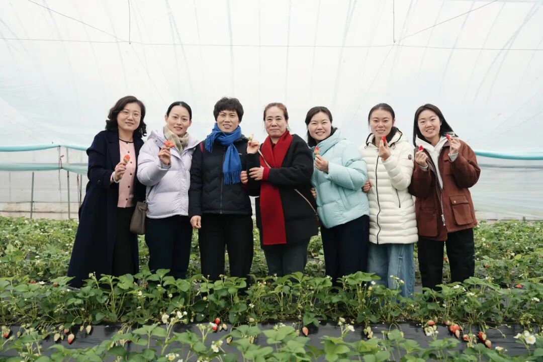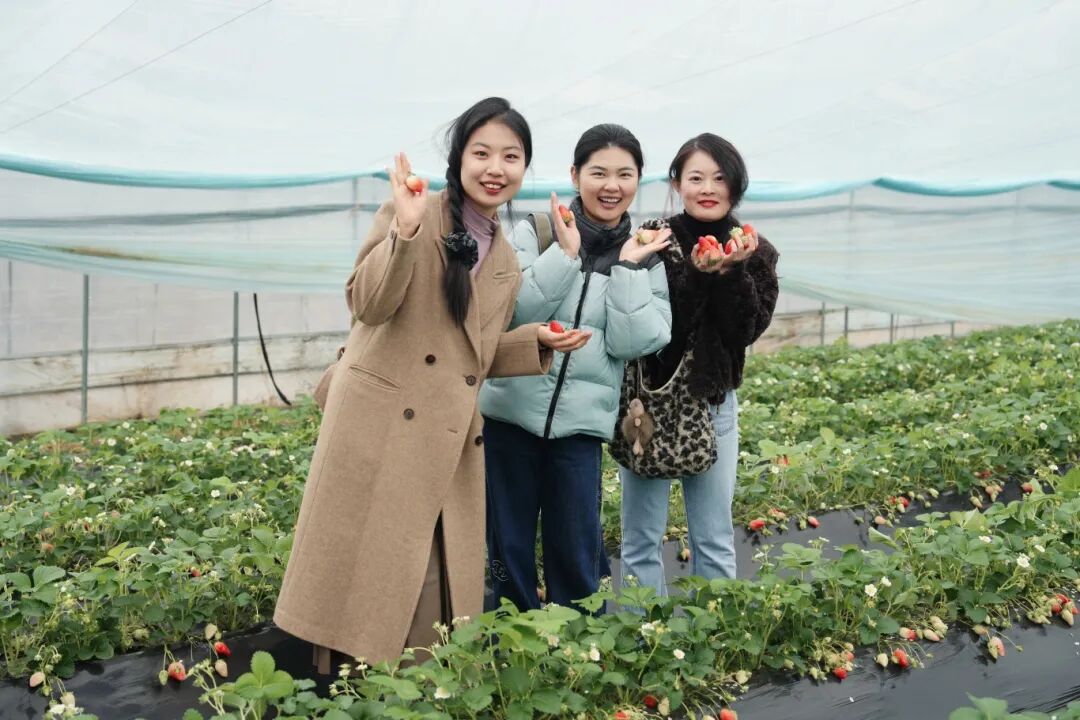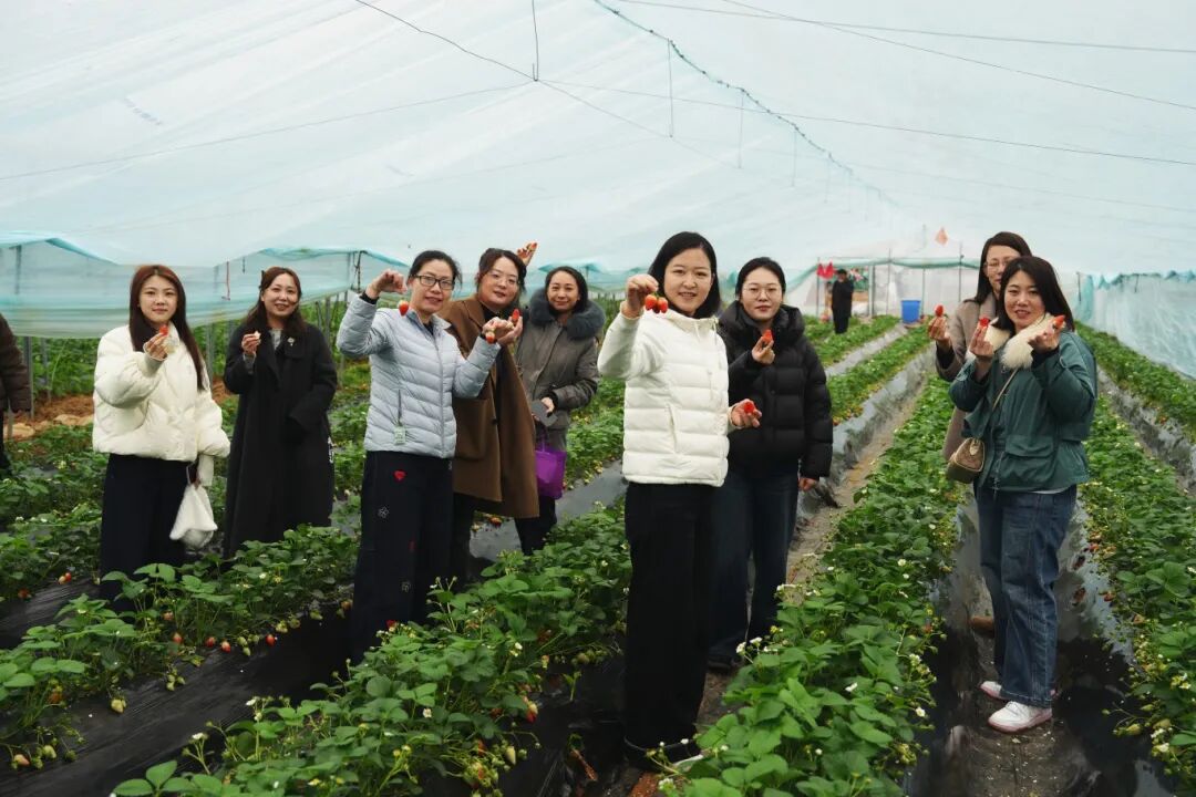 第一站,大家来到了青岛胶州市洋河镇莲花山,开启了欢乐的草莓采摘之旅。走进温室大棚,一颗颗饱满鲜红的草莓挂满枝头,果香四溢。大家卸下工作的疲惫,化身“采摘能手”,穿梭在绿叶间,在亲近自然的过程中释放压力、愉悦身心,感受春日的生机与美好。