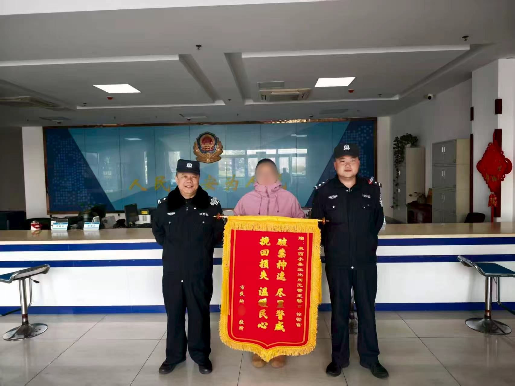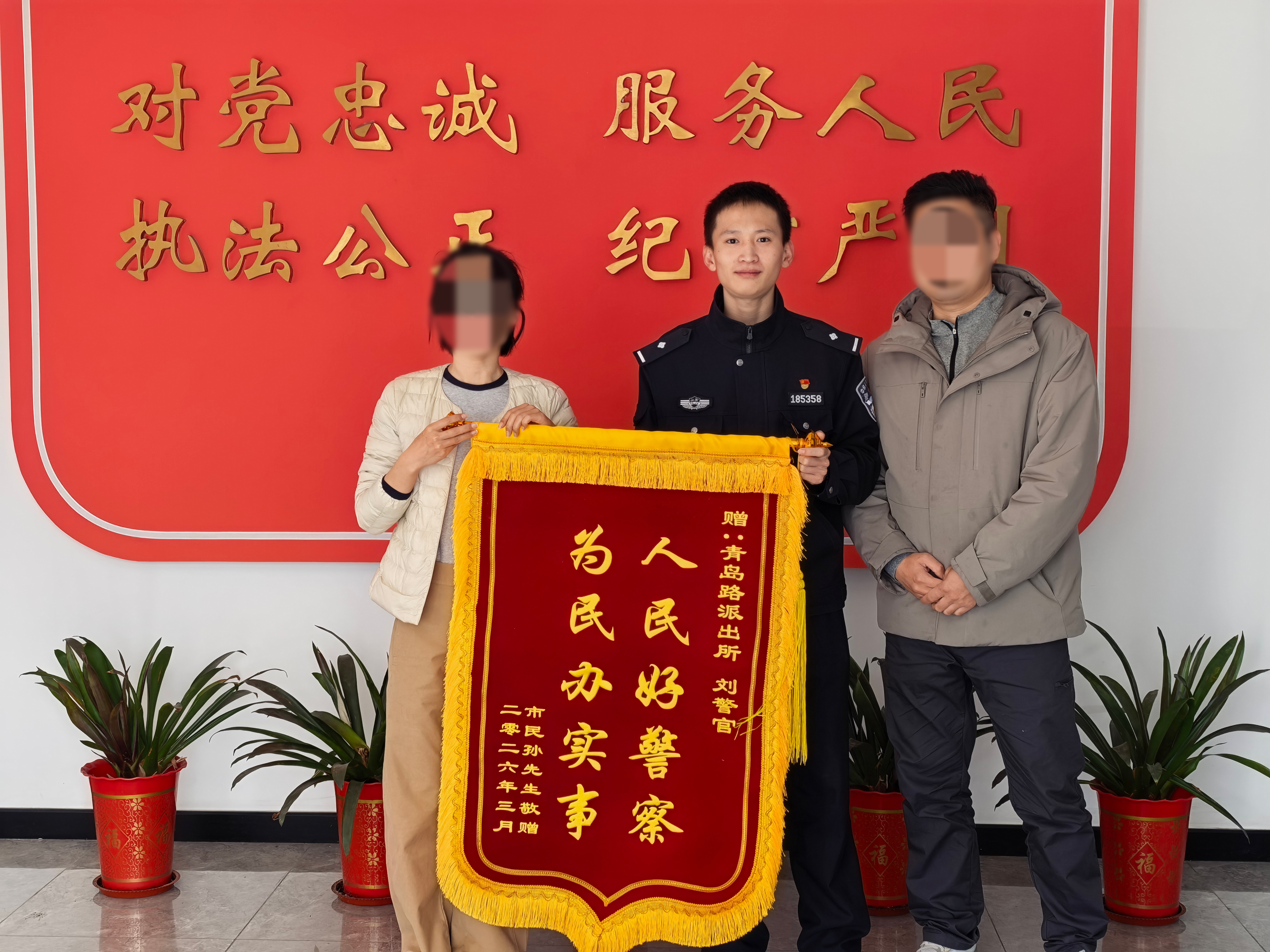 3月16日,青岛莱西市民陶女士将一面印有“破案神速尽显警威 挽回损失温暖民心”的锦旗送至水集派出所,对民警快速帮助其找回遗失的手机表示感谢。