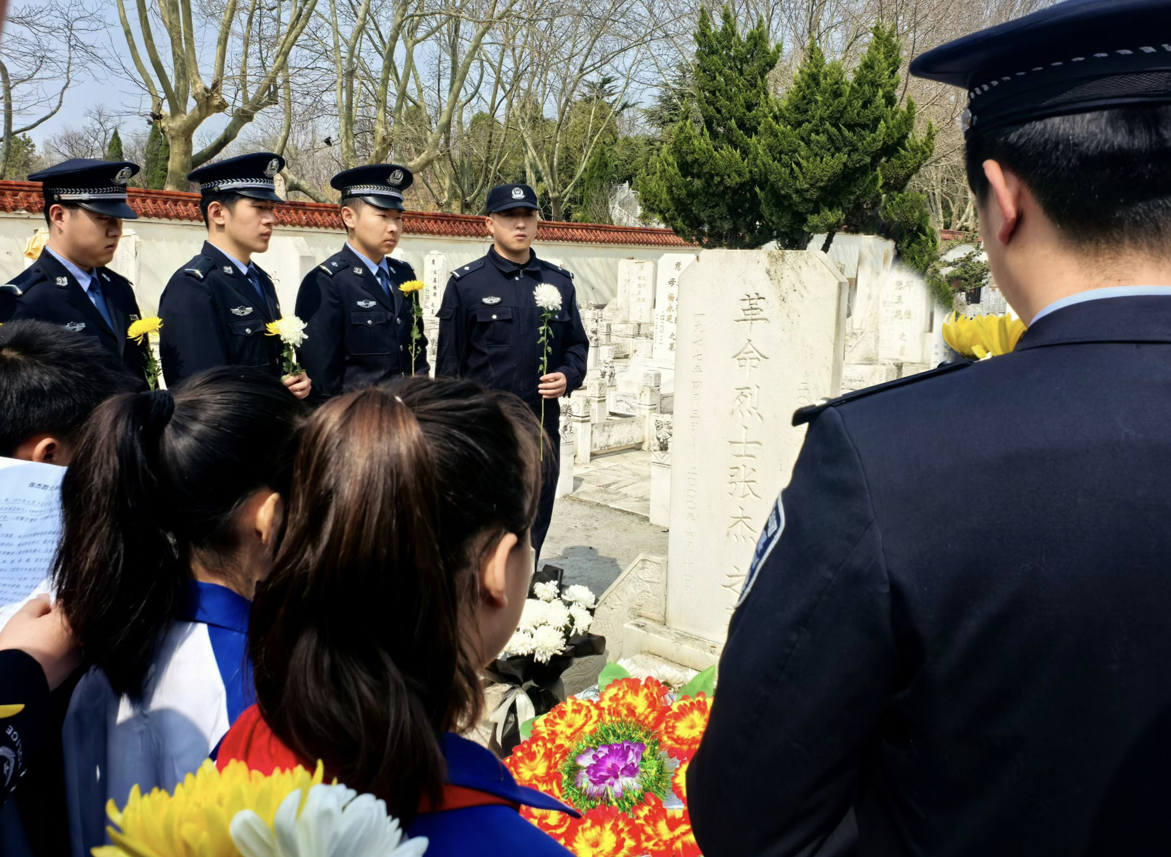 烈士伟绩,百世流芳。在公安系统二级英模张杰烈士墓前,民警和少先队员代表向烈士敬献鲜花,全体人员向烈士鞠躬默哀,表达对烈土的怀念和无限敬仰,新警杨扬代表青年民警表态发言,全体新警重温入警誓词。