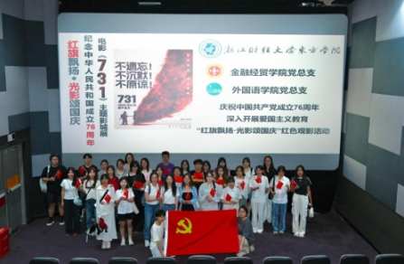 隆重庆祝中华人民共和国成立七十六周年,深入开展爱国主义教育,引导广大师生厚植家国情怀、赓续红色血脉,学院党总支研究决定举办“红旗飘扬·光影颂国庆”红色观影活动。金融与经贸学院师生党员代表集中观看了红色主题影片《731》,深入学习贯彻党的二十大精神,弘扬爱国主义精神,激发全体人员的使命担当,通过沉浸式观影学习,引导群体铭记历史、砥砺奋进。