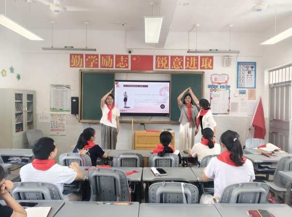 在少先队标志礼仪基本规范和少先队入队前教育环节,王老师采取“理论讲解+现场示范+互动纠错”的方式,从红领巾的正确系法、队旗的规范持举与行进姿势、队礼的标准动作要领,以及队会仪式中“出旗、唱队歌、呼号、退旗”等少先队基本知识进行了细致的培训。参训的各位中队辅导员全程认真聆听、详细记录,主动参与互动练习,现场学习氛围浓厚。