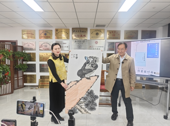 优秀青年诗人、书画鉴赏家曾素霞(左)在直播现场给著名诗人李勇赠送绘画作品以示致敬。(谢晓丽 摄/供图)
