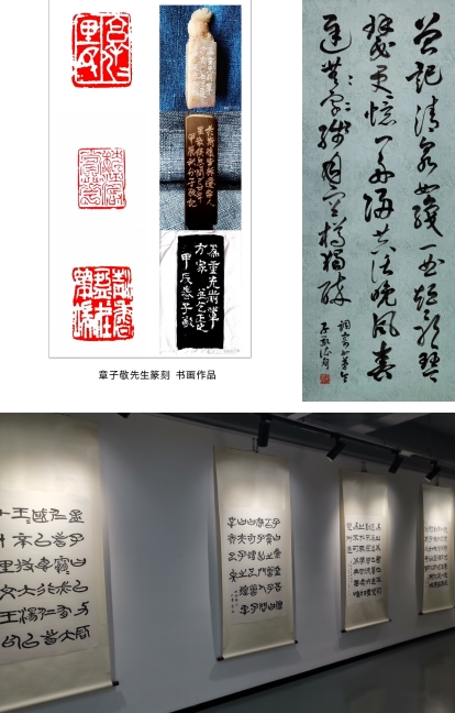 展览现场,陈敏、汤将胜、韩健丰、祁爱玲等艺术爱好者齐聚一堂。他们认真观摩了章子敬艺术家的诗书画印系列作品,并频频称赞。