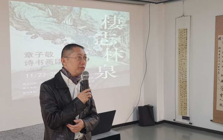 展览现场,沪上著名学者、书画家、篆刻家章子敬先生谦逊致辞,衷心感谢各位领导与朋友拨冗莅临。章子敬从国学中阐释了展览主题“栖志林泉”的文化内涵。这一主题,取意于北宋郭熙《林泉高致》中“林泉之心”,寄托庄子虚静之思。他与大家一起分享了自己的从艺经历:幼承家学,其父为著名画家陈丹青的启蒙老师,十二三岁时舍西画而专攻传统诗书画印,在父亲“此艺非仅笔墨,更需国学根基”的教诲下,从《左传》启蒙,修习至今。章子敬谦称自己“博涉未精”,表示此次展览“非为展示成就,而是立一新起点”,恳请诸位方家不吝赐教。