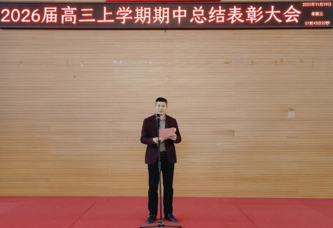 本网江西讯(邱顺飞)朔风渐紧,染就初冬清冽底色;时光竞速,叩响高考冲刺门铃。现在,我们正站在秋实与冬藏的交汇点,更站在距离2026年高考仅剩200天的关键节点。为总结期中得失,表彰优秀榜样,凝聚冲刺力量,11月19日上午,江西信丰县第二中学高三年级在学校体育馆召开“高三年级上学期期中总结表彰大会”。全体高三师生齐聚一堂,这既是对过往半程耕耘的复盘沉淀,更是向未来200天冲刺的庄严誓师,每一份坚持都值得被铭记,每一份突破都应当被喝彩!大会由高三年级汤钦平副组长主持。