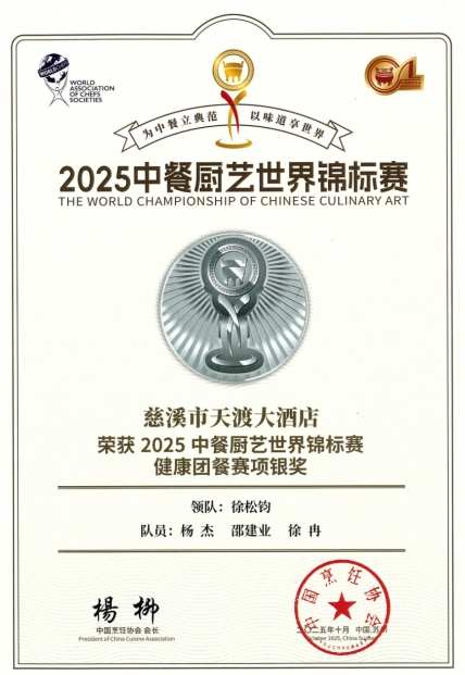 “载誉归来,初心不改。”徐松钧队长在接受采访时坚定说道,“此次获奖是我们团队新起点,我们将继续秉持匠心,不断推陈出新,将更多优质美食体验带给每一位顾客。我们要让‘慈溪味道’走向世界,让更多人了解和喜爱我们的美食文化。未来,我们计划在全球开设更多分店,将‘慈溪味道’传播到世界每一个角落。”天渡大酒店一直以来致力于为宾客打造融合多元风味、提供高品质食材与极致用餐体验的综合性餐饮服务。凭借专业厨师团队、优雅用餐环境以及细致入微的服务,满足了商务宴请、家庭聚会、朋友聚餐等各类用餐场景需求,成为慈溪当地餐饮行业标杆之选。