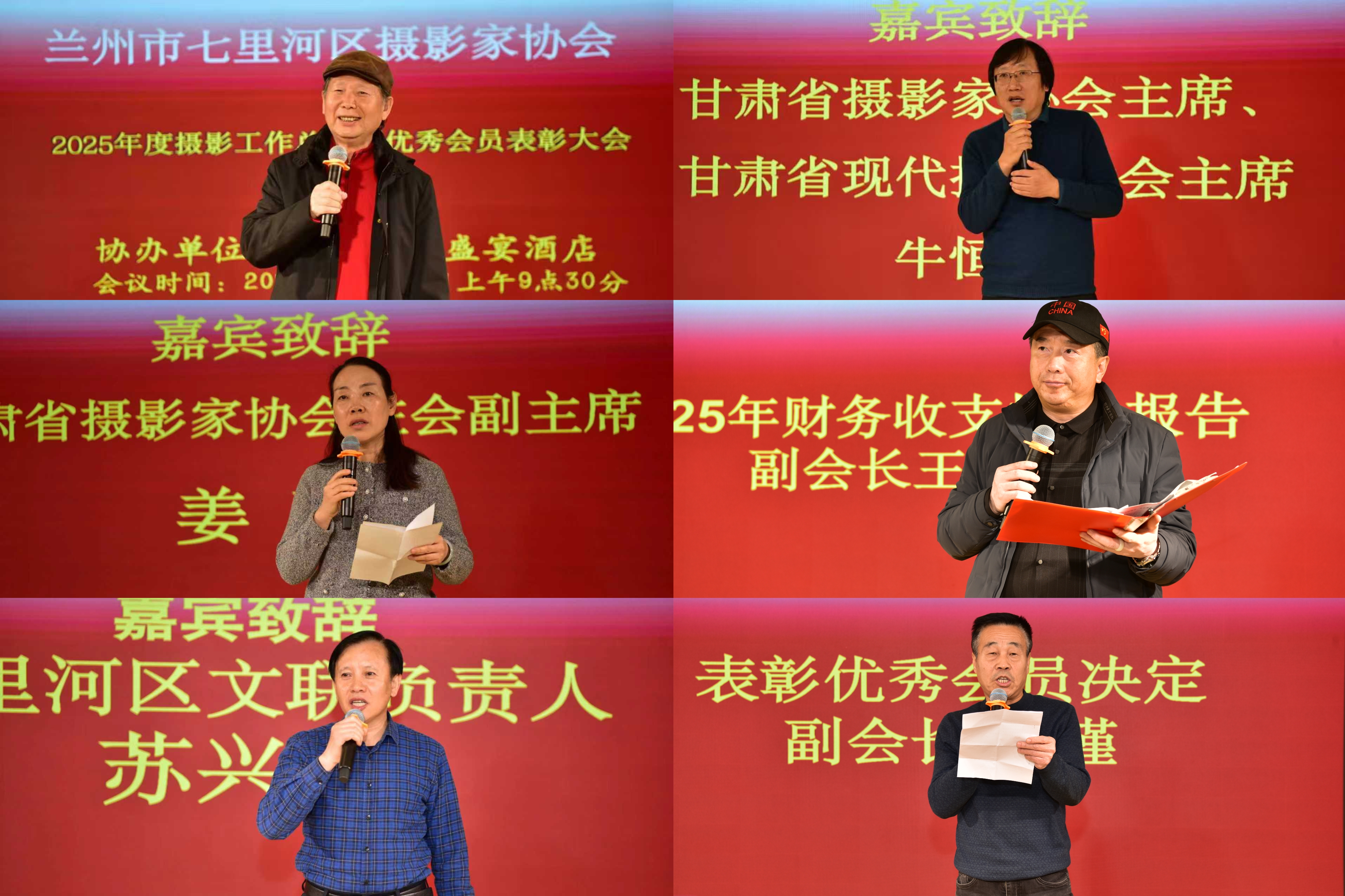 年会由协会副会长王雄正主持,七里河区委宣传部副部长曹小云,区民政局副局长巨生荣,区文联负责人苏兴龙,以及甘肃省摄影家协会主席牛恒立等省、区相关部门领导和嘉宾应邀出席。王雄正代表协会理事会向长期关心支持七里河区摄影事业发展的各界人士表示感谢,并向全体会员及摄影同仁致以诚挚问候。