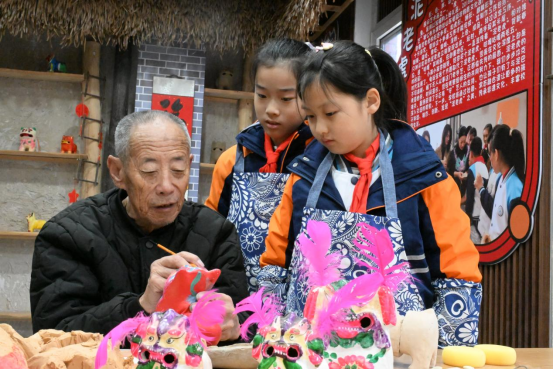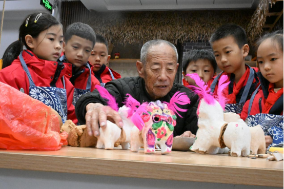 在山东省青岛市即墨区创智实验学校,“泥老虎”非遗传承“守”艺人于正寿给学生们讲解“泥老虎”的制作技艺