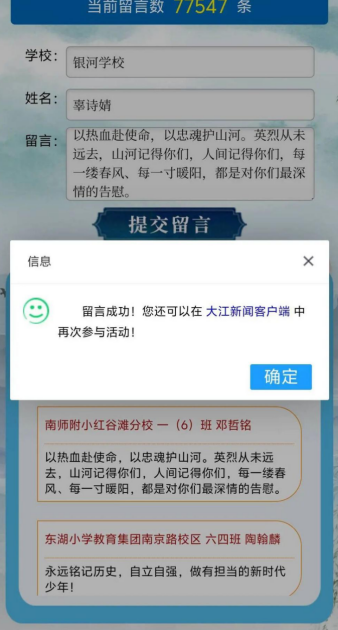 云端寄哀思,心语敬英雄。同学们还积极参与“网上祭英烈”寄语活动,在线上郑重写下真挚追思与祝福:“革命先烈永垂不朽”“吾辈当自强,传承英烈精神”……一条条暖心寄语,跨越时空,表达对英烈的感恩与敬意。
